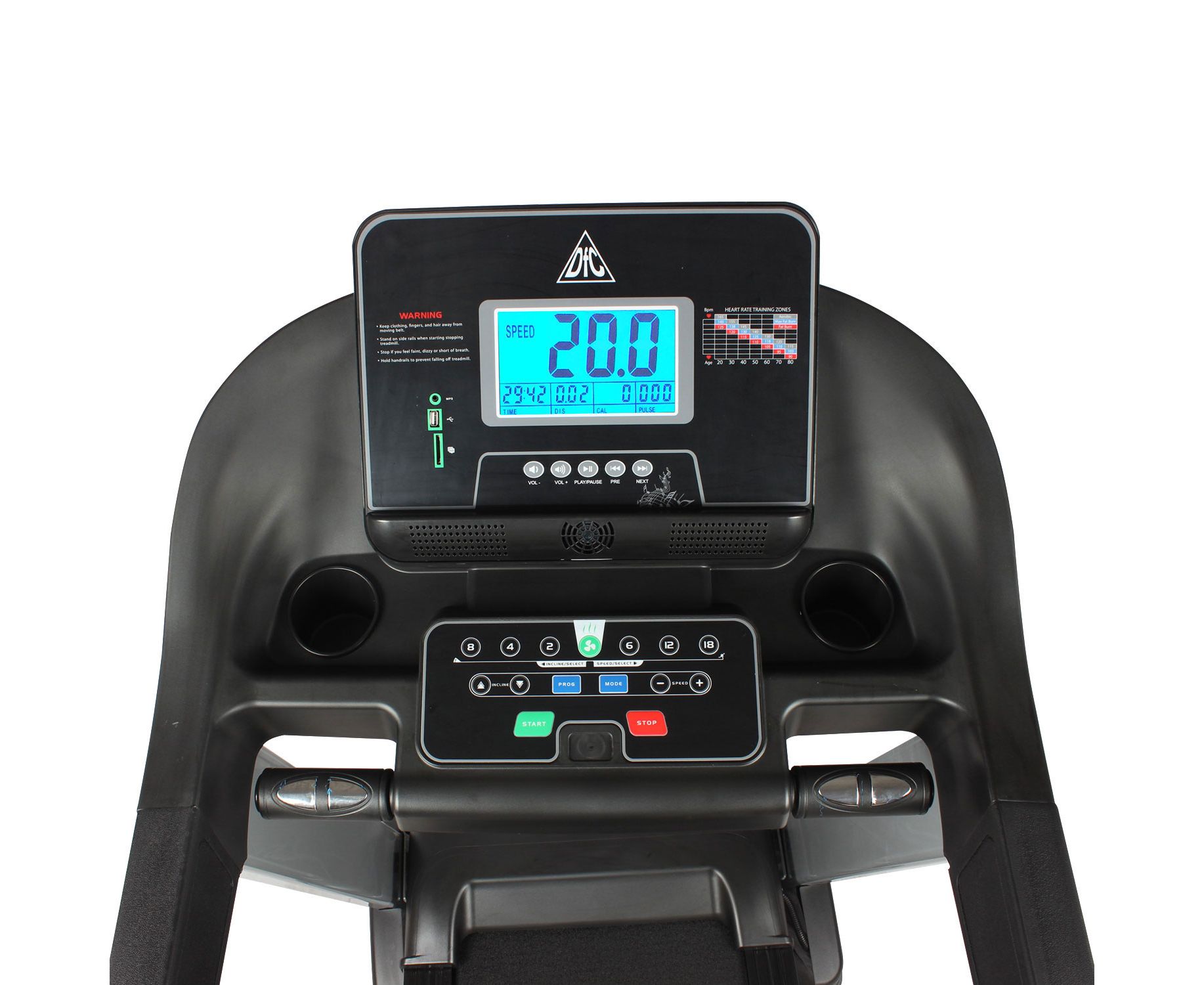 Встроенные динамики звуковой системы и возможность подключения дополнительных устройств через разъемы MP3 и USB помогут провести тренировку под любимую мелодию. Пользователь может нажимать их для увеличения или уменьшения скорости 0,1 км/ч в одно касание. При нажатии кнопки быстрой скорости, например, 6 км/ч, 12 км/ч и 18 км/ч, дорожка переключится сразу на нужное значение скорости. Кнопки управления проигрывателем удобно расположены под экраном на консоли.