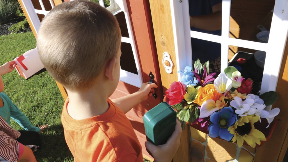 Игровая кухня является идеальным местом для творчества и кулинарии благодаря раковине, плите и кухонной утвари. В игровом домике есть две двойные доски для рисования мелом, часы, а также почтовый ящик и игровой телефон.