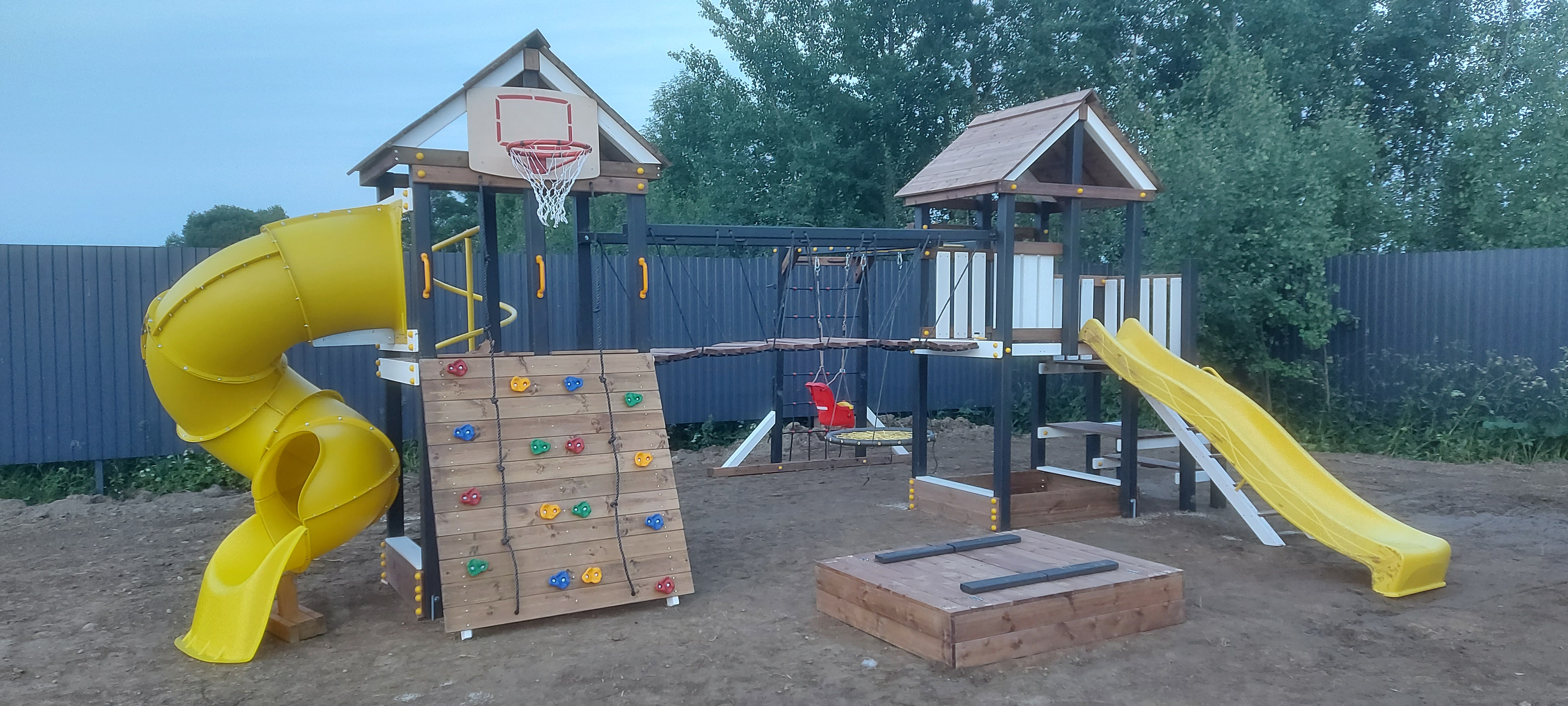 Обращаем Ваше внимание, что фактический цвет детской площадки может отличаться от представленных фото на сайте. Специфика окраски нетоксичными пропитками и красителями допускает отклонения в цветовой гамме отгружаемых изделий. Также обратите внимание, что фактический цвет может отличаться из-за цветопередачи устройства на котором Вы смотрите фото. Производитель оставляет за собой право менять цвет отдельных деталей и комплектующих(включая пластик, канаты и пр.), при этом сохраняя весь функционал и характеристики товара.