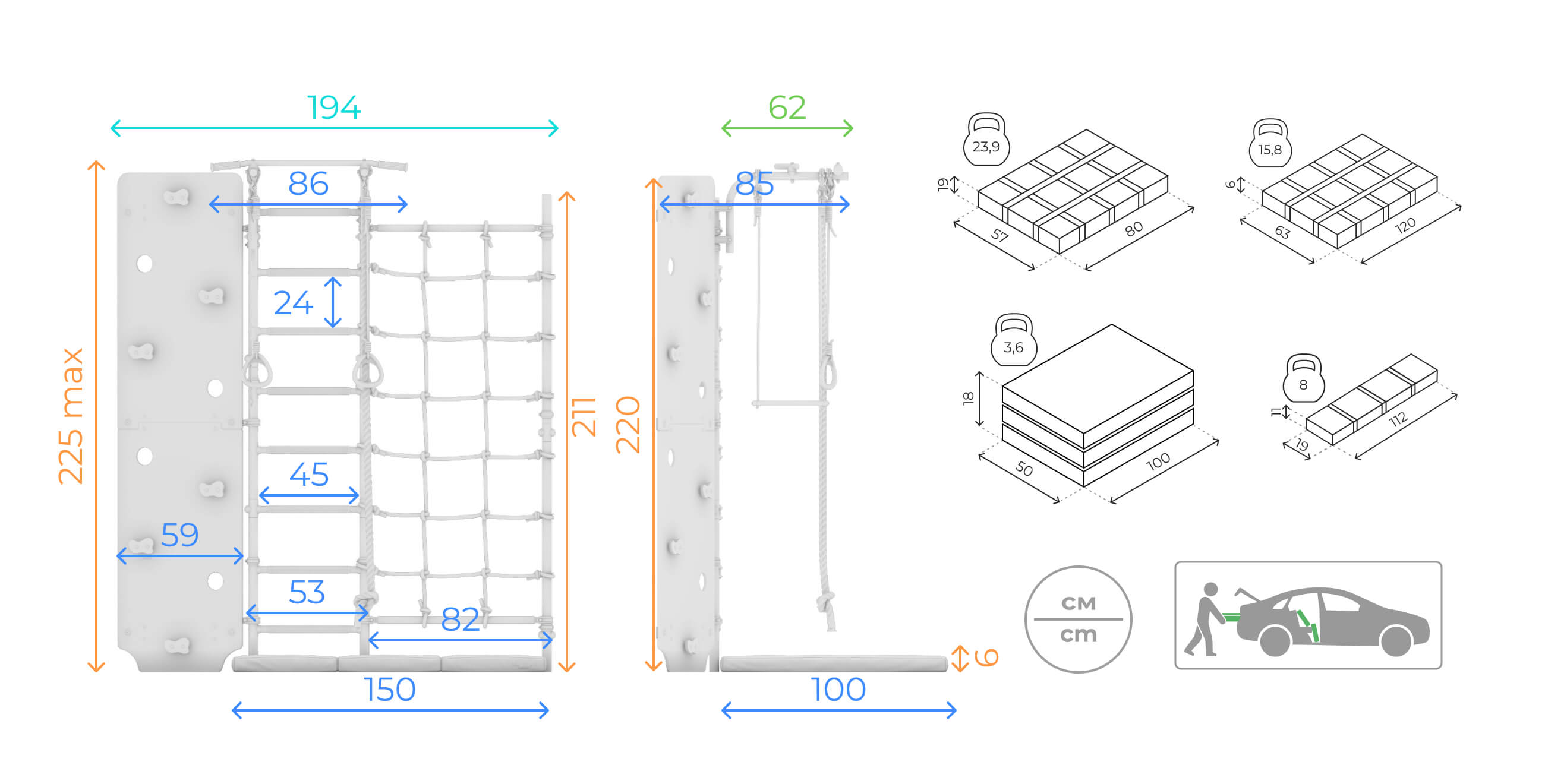Комплекс дополняет мягкий щит в три сложения. Компактный мат обеспечивает комфортные и безопасные условия во время занятий на шведской стенке.